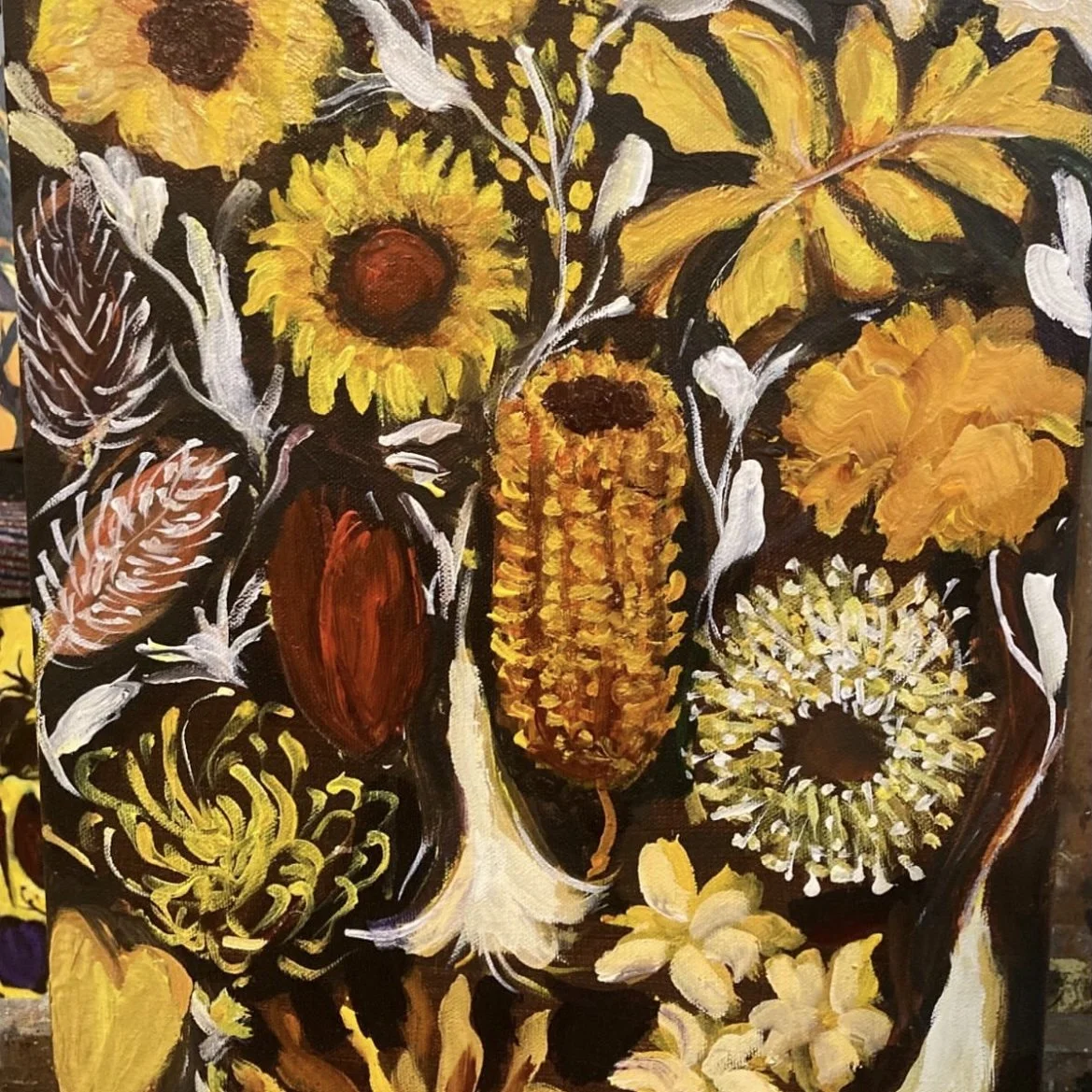My paintings in this exhibition portray an emotive rendition of colour and music which always plays a significant role in the creation of my works. My obsession with music gets me into a state where I become totally intuitive. A music teacher once looked at my work and I might have Synesthesia.